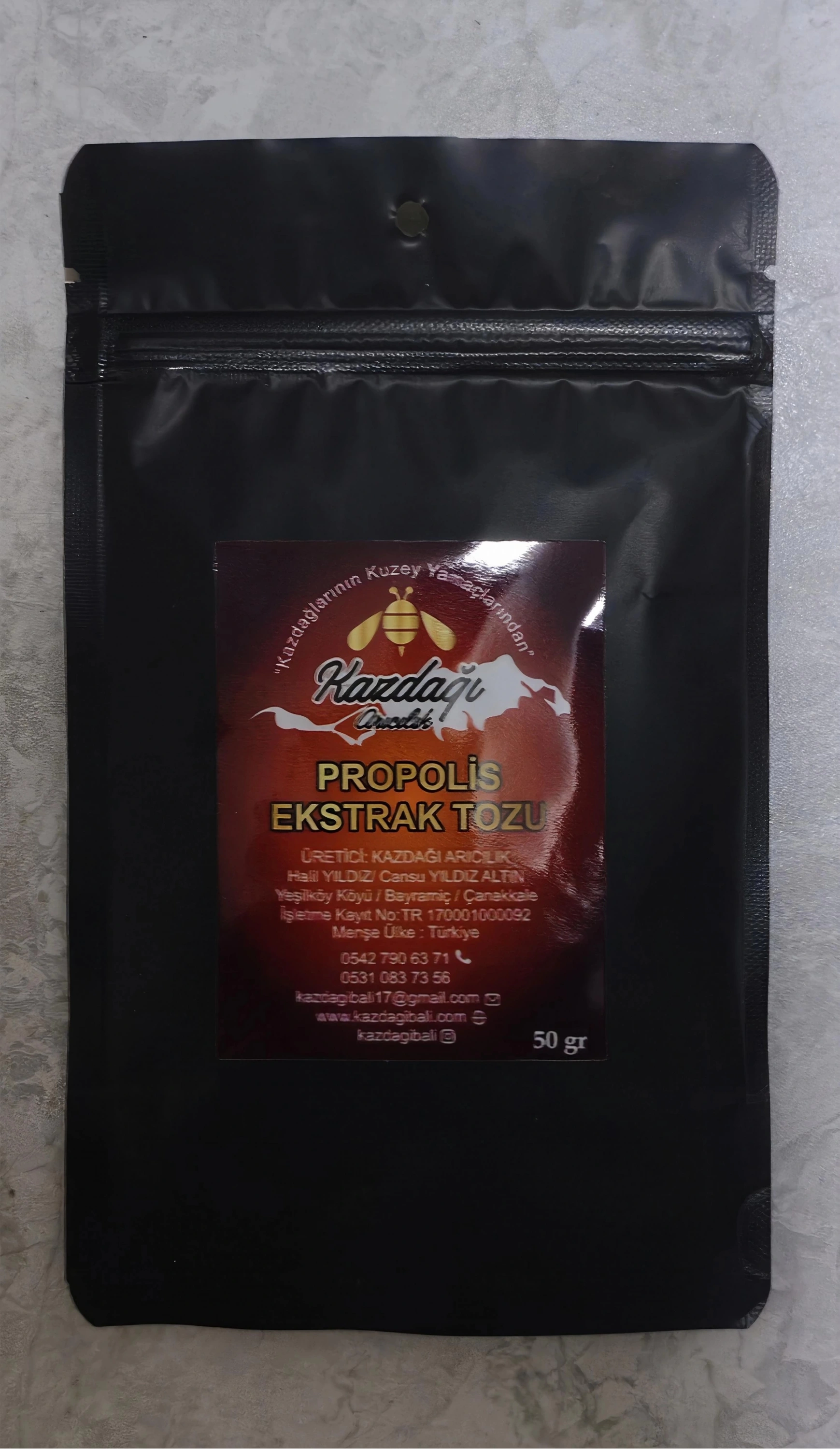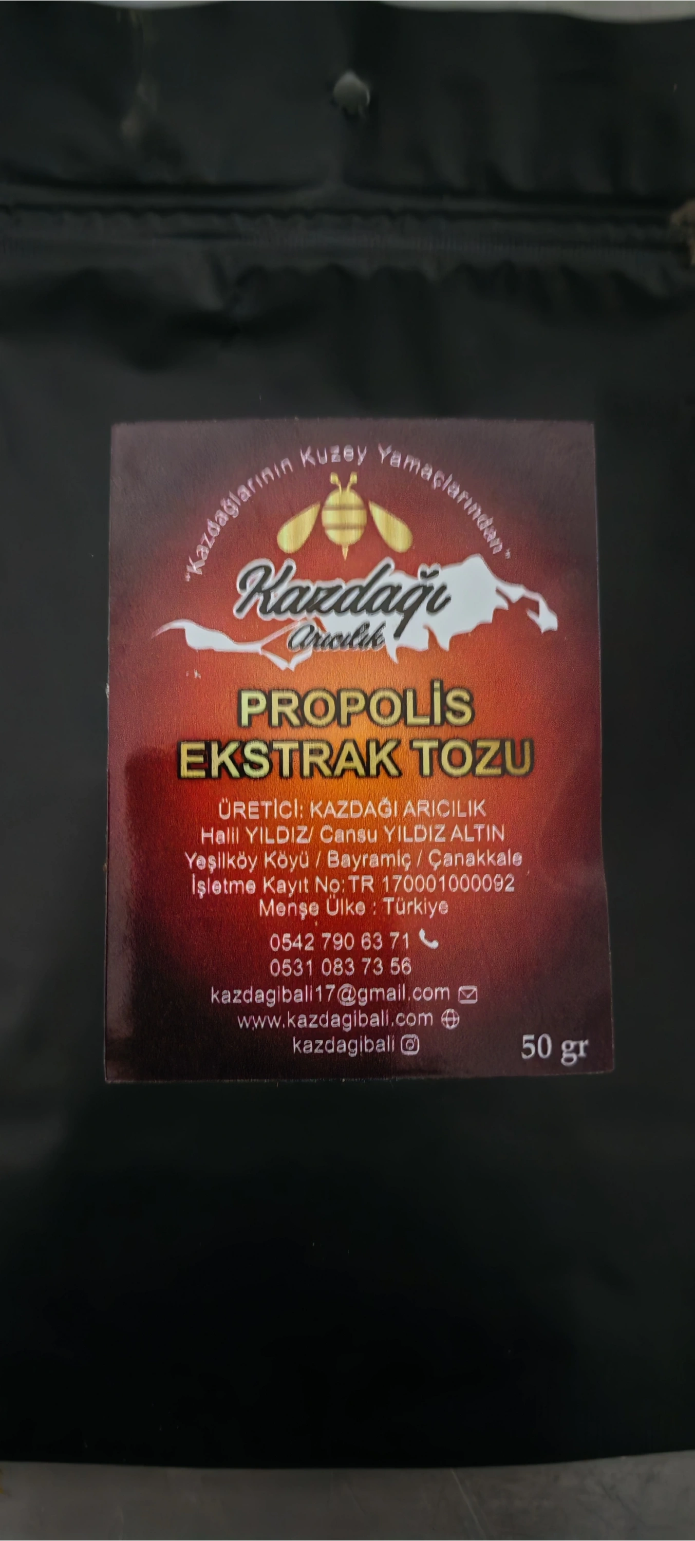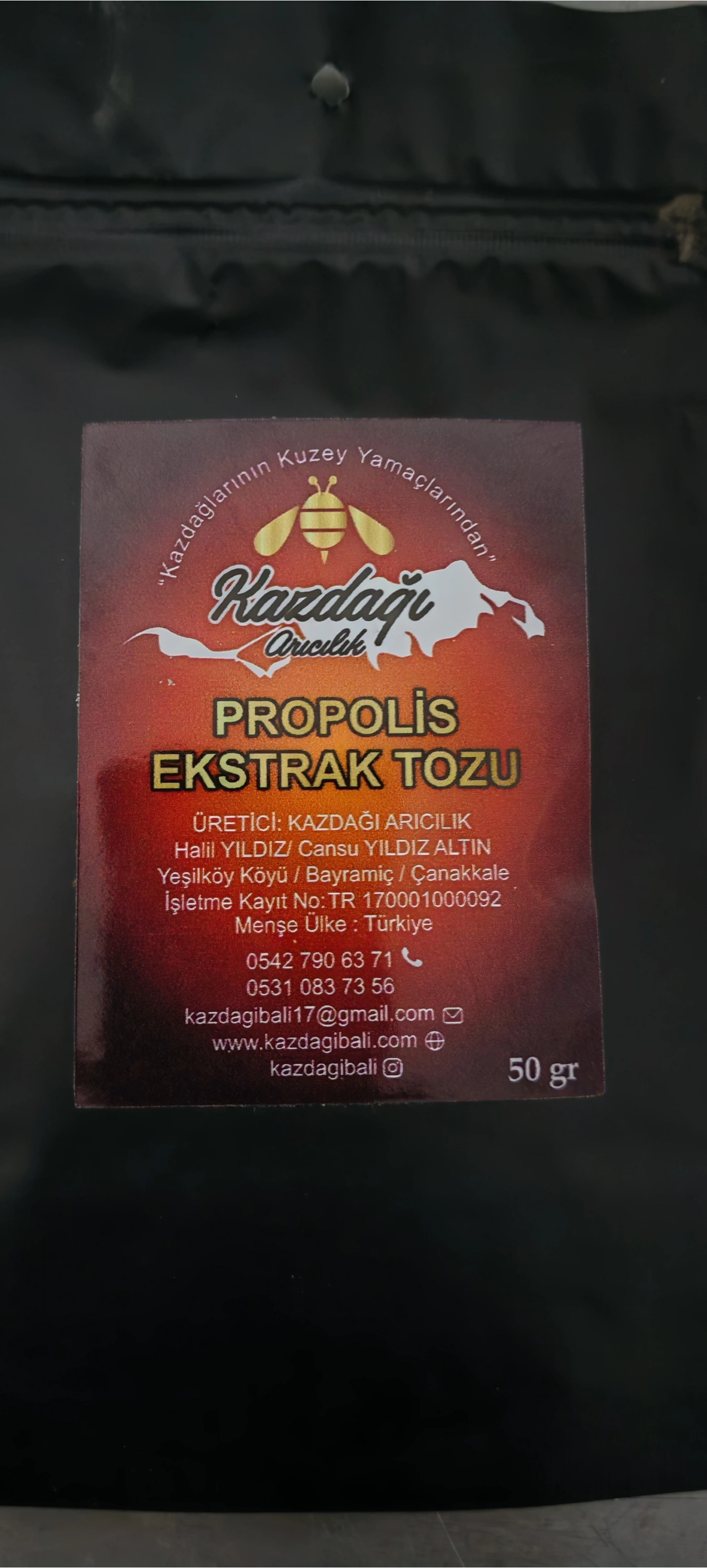 Toz Propolis Arı kovanı üzerine koyulan propolis tuzakları arılar propolisle doldurduktan sonra hasat edilir. Çıkan ürün yüksek devirli gıdaya uygun öğütücü makinelerde işlenerek toz propolis haline getirilir.